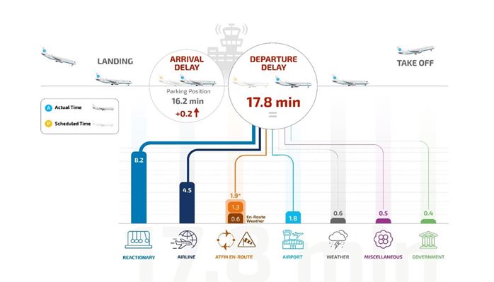 Delays caused by airport restrictions, which include local ATC delays as well as ATFM arrival regulations due to ATC capacity, staffing, equipment, etc., contributed 1.8 minutes per flight on departure. Government procedures, including security and customs checks, added an average of 0.4 minutes per flight.