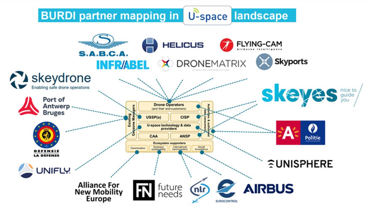 The Belgium-Netherlands U-space Reference Design Implementation (BURDI) is a SESAR 3 JU Digital Sky Demonstrator co-funded by The European Climate, Environment and Infrastructure Executive Agency (CINEA) within the framework of the Connecting Europe Facility. Coordinated by skeyes, the Demonstrator brings together 18 highly complementary partners, representing all stakeholders necessary to implement U-space in complex environments, including an ANSP, airports, a common information services provider (CISP), a U-space Service Provider (USSP), drone operators and other relevant ecosystem supporters.